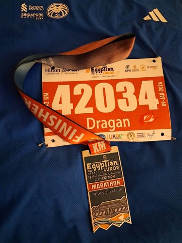 On je tog dana trčao maraton u gradu Luxor u Egiptu i osvojio medalju u svojoj kategoriji.Trka je vodila preko pustinje delom tako da je bilo peska u očima i ustima,organizacija je bila odlična sa dosta publike pored staze,ističe Mladenović.