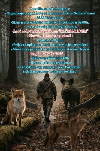 Lovačka sekcija Proštinac kod Svilajnca u saradnji sa LU “Fazana” Sedlare u nedelju 25.januara 2026.godine organizuje Veliku hajku-lov na šakale,lisice i divlje svinje.